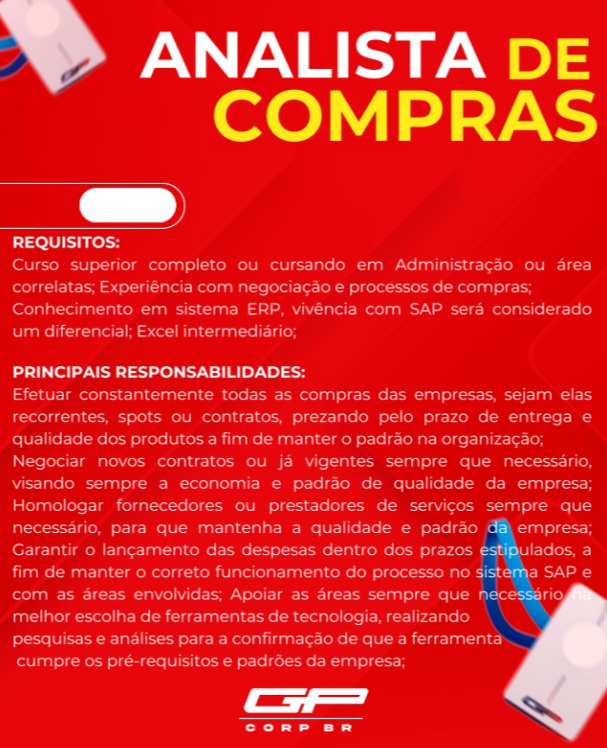Enviei seu currículo para ➡ recrutamento@gpcorp.br ⬅ ou clique no link ➡ AQUI ⬅