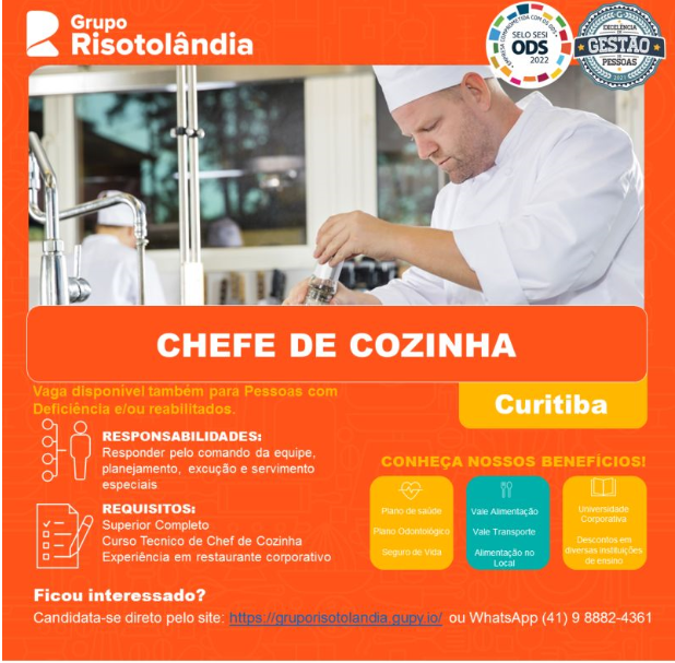 Chefe de Cozinha (25/11/22) Possui interesse? Então saiba mais sobre a vaga em clique aqui e candidate-se!