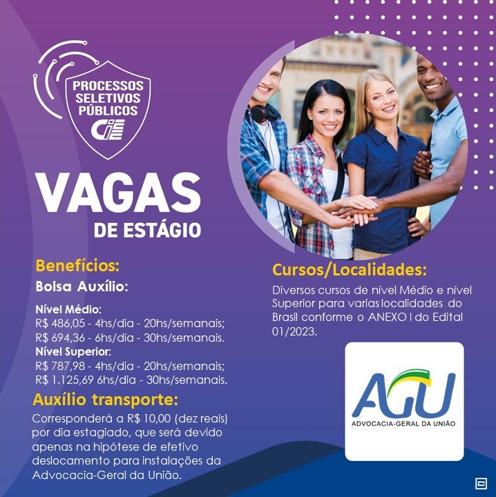 1º – Inscrição e Prova online: Somente pela internet entre os dias 16/01/2023 até às 12h00 (horário de Brasília) do dia 28/02/2023.2º – Entrevista: Execução a cargo da Advocacia Geral da União – AGU com possibilidade de aplicação de questão discursiva, objetiva e análise curricular, conforme conveniência da Unidade Concedente.