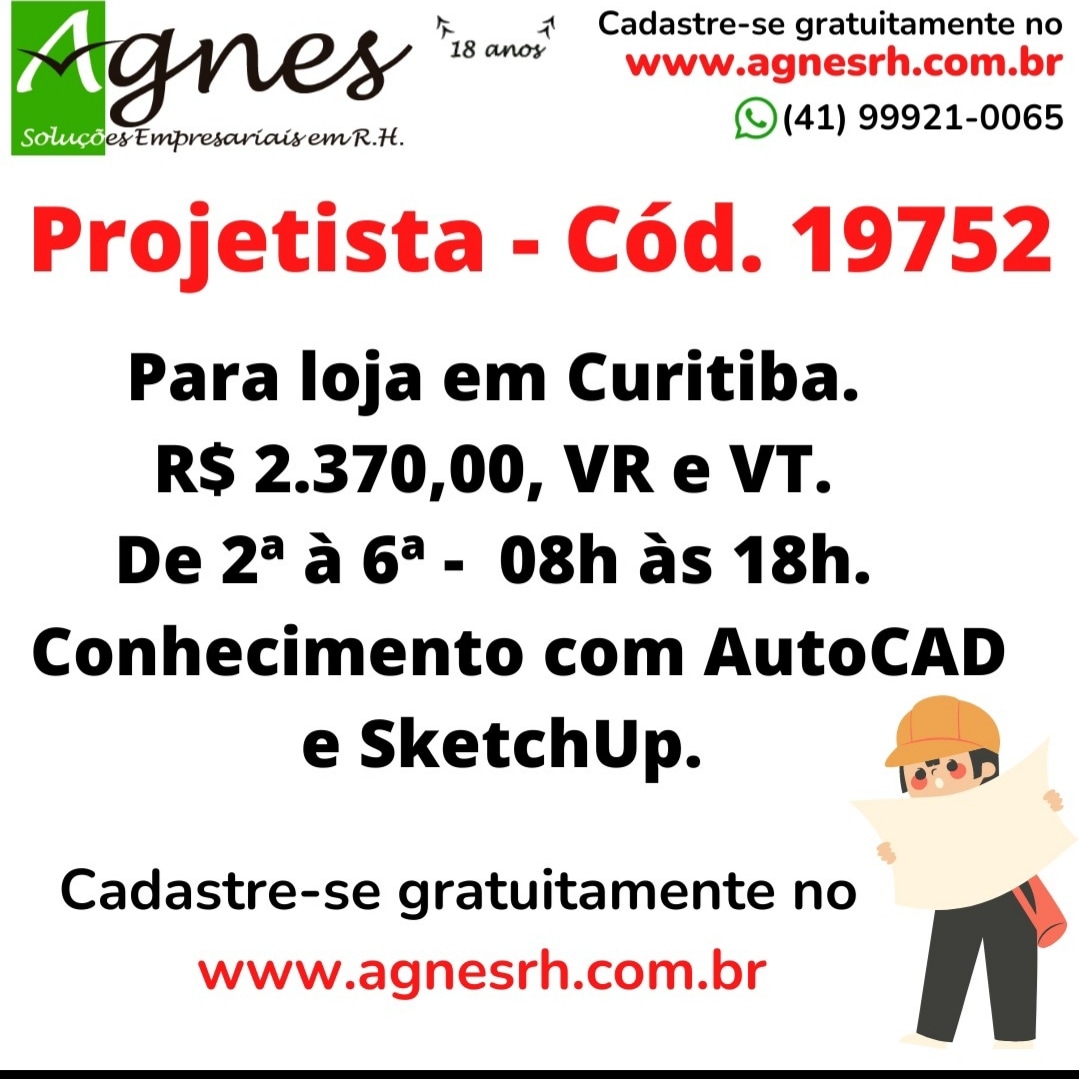 Projetista (05/04) Como participar? É gratuito, porém PRECISA: Cadastrar-se no site da agnesrh.com.br na vaga cód.19752 pelo link Clicando aqui
