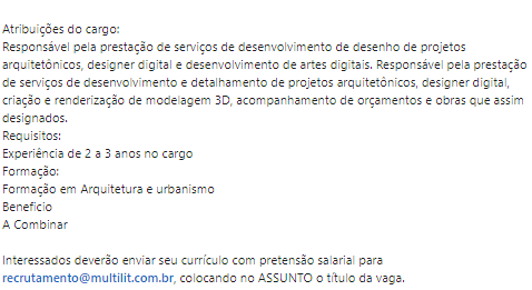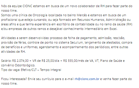 1 vaga com Carga horária: 4 horas diárias – Horário: 08:00 às 12:00 de 2° a Sábado – Bolsa: R$ 640,00/Mes + VT