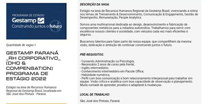 Oportunidade de Estágio – Recursos Humanos (22/02)