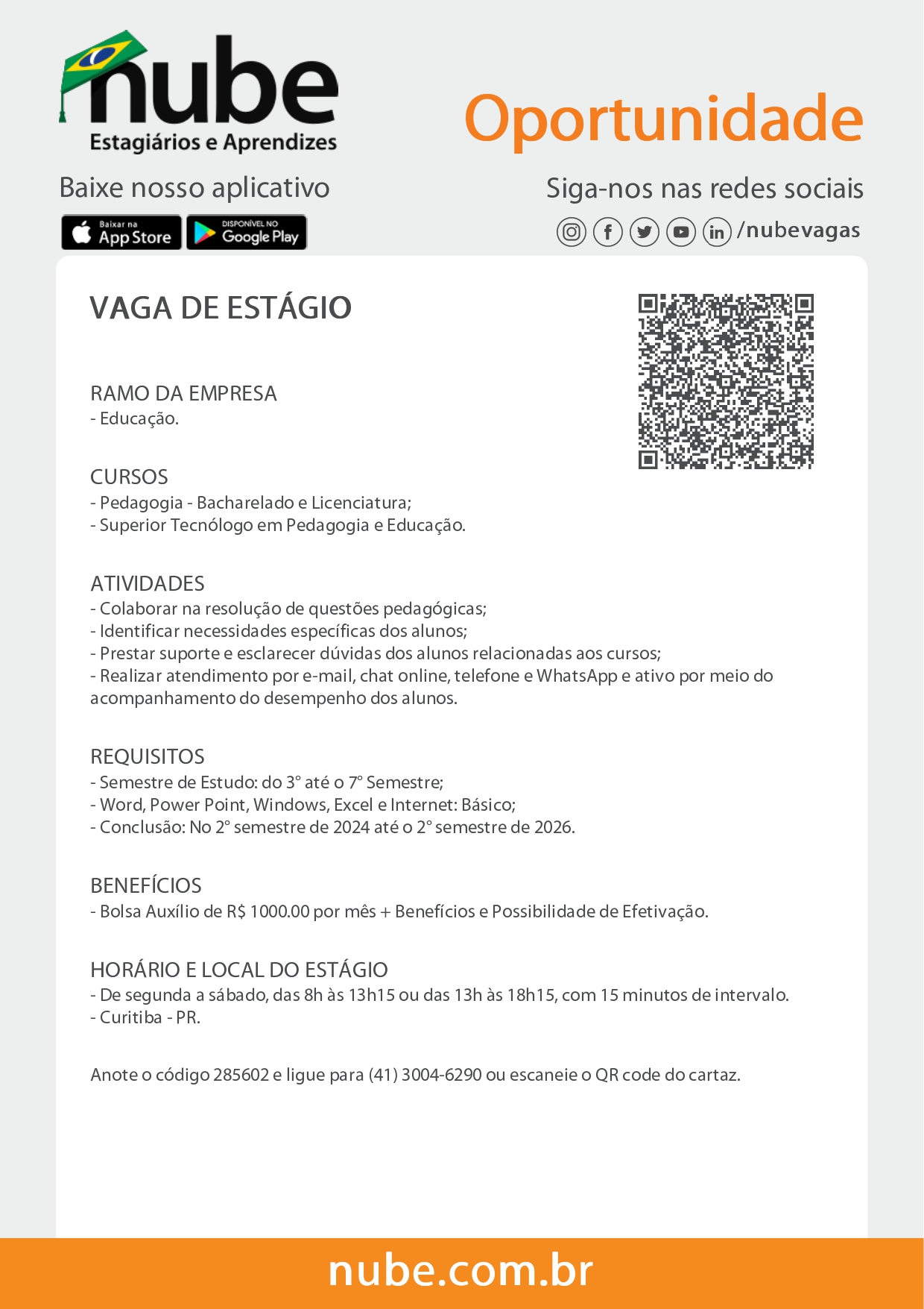 • Disponibilidade para atuar no horário das 08h00 às 14h00;