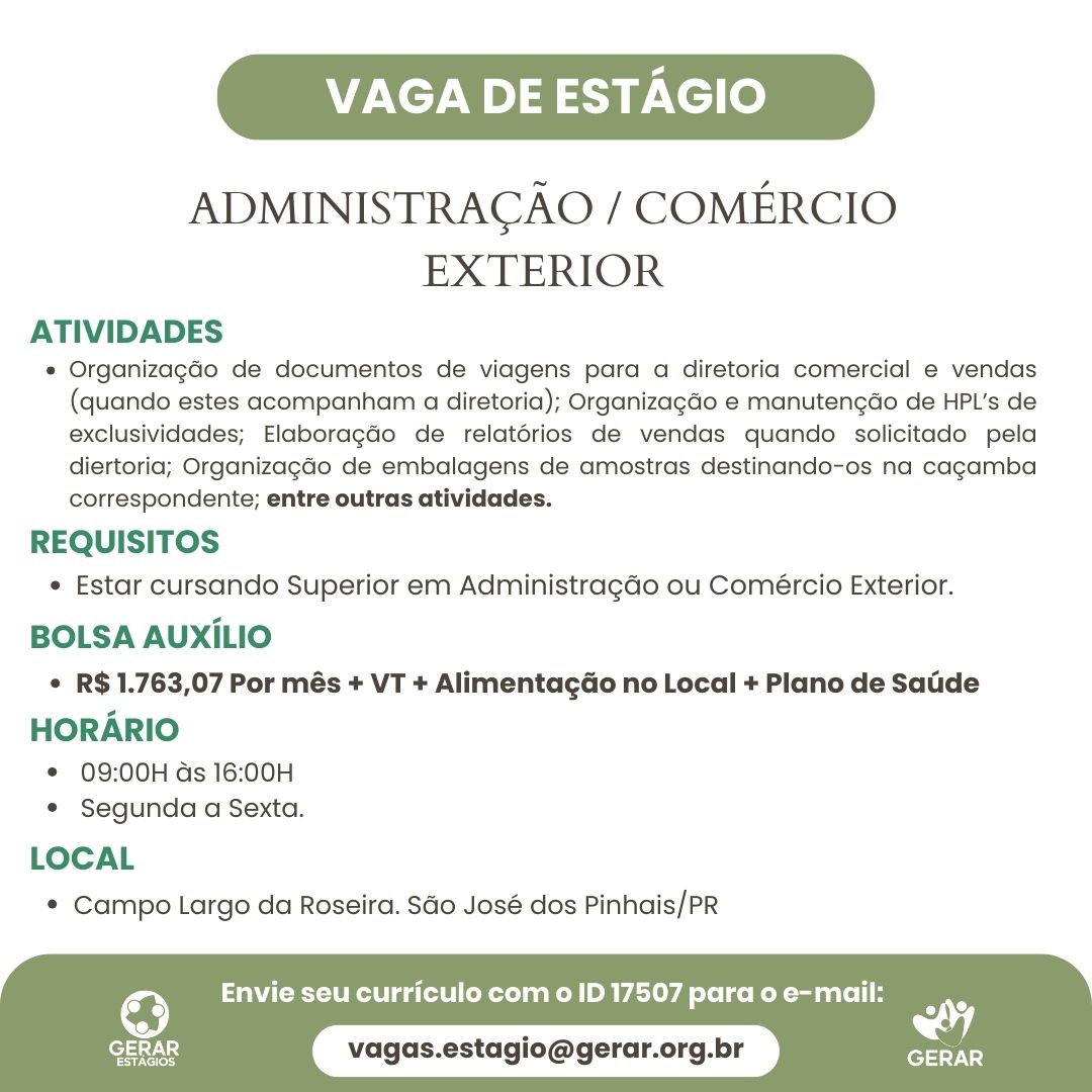 Jornada: De segunda à sexta-feira das 08h30 às 15h30 com 1 hora de intervalo (ou negociável de acordo com grade da faculdade)