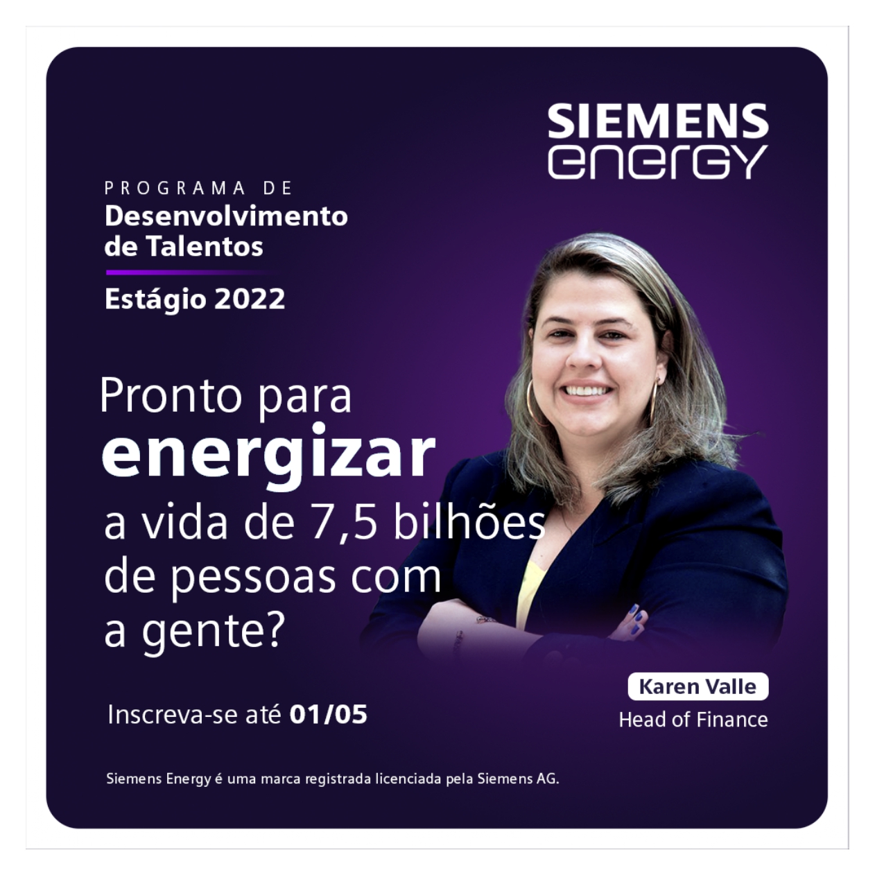 Programa de Desenvolvimento de Talentos Estágio 2022 | Siemens Energy (12/4) Para mais informações e inscrições Clique aqui