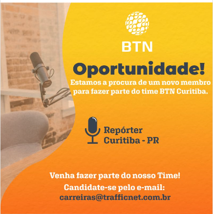 Interessados usar no título do e-mail VAGA REPÓRTER CURITIBA, podem enviar seu CV, junto com dois boletins de trânsito demonstrativos em formato .mp3, para o email carreiras@trafficnet.com.br