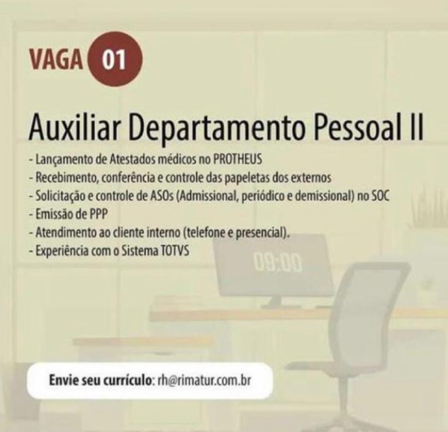 Vaga Auxiliar de Departamento Pessoal (29/06)