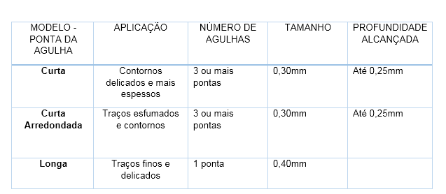 O profissional deve estar atento e ter conhecimento da propriedade de seus instrumentos de trabalho. As agulhas utilizadas devem ser de aço cirúrgico e inoxidável, material que apresenta maior resistência, trazendo segurança e precisão; elas possuem diferentes tamanhos e formatos, cada uma tem uma função distinta, porém o profissional pode escolher o formato que mais o agrada e favorece o desempenho de sua técnica10 (QUADRO 2).