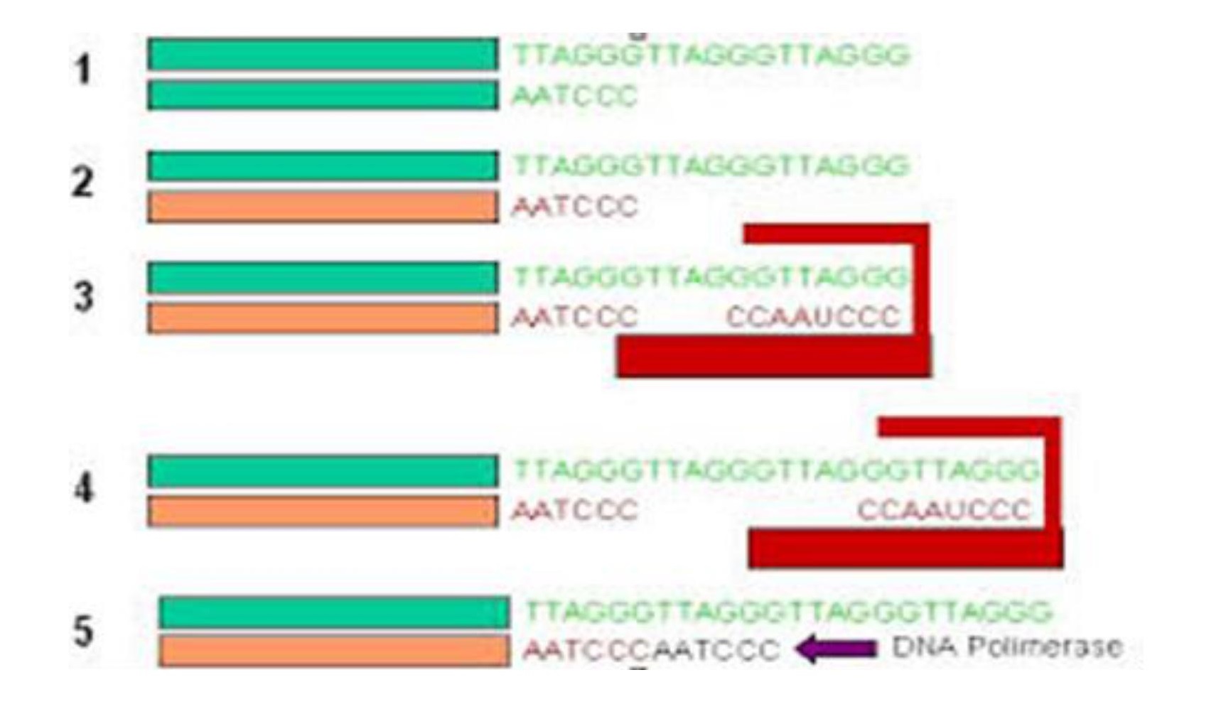 Figura 1: Esquema de representação da ação da telomerase. Pode ser visualizado na fase 1 a molécula- filha de DNA com fragmento neoformado e seu terminal não duplicado. Na segunda fase, esta evidenciada a fração neoformada. Na fase 3, verifica-se o complexo da telomerase com seu RNA complementar à repetição telomérica. Já na fase 4 a telomerase, amplificou a sequência da fita conservada. O segmento conservado alongado, a DNA Polimerase pode atuar (seta) normalmente, assim permitindo a duplicação do segmento telomérico na fita neoformada (9).