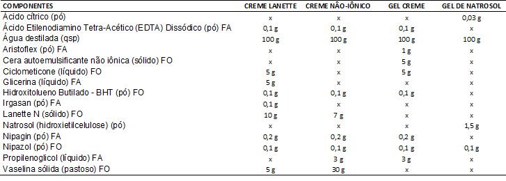 FA – Fase aquosa; FO – Fase oleosa; qsp – quantidade suficiente para; x indica que o constituinte não foi utilizado na formulação.