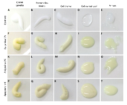 Figura 1: Características visuais das formulações com diferentes concentrações de apigenina. Foto A) formulação controle de creme Lanette; Foto B) formulação controle de creme não-iônico; Foto C) formulação controle gel-creme; Foto D) formulação controle gel de Natrosol; Foto E) formulação controle sérum sepigel; Foto F) creme Lanette com apigenina 1%; Foto G) creme não-iônico com apigenina 1%; Foto H) gel-creme com apigenina 1%; Foto I) gel de Natrosol com apigenina 1%; Foto J) sérum sepigel com apigenina 1%; Foto K) creme Lanette com apigenina 3%; Foto L) creme não-iônico com apigenina 3%; Foto M) gel-creme com apigenina 3%; Foto N) gel de Natrosol com apigenina 3 %; Foto O) sérum sepigel com apigenina 3%; Foto P) creme Lanette com apigenina 5%; Foto Q) creme não-iônico com apigenina 5%; Foto R) gel-creme com apigenina 5%; Foto S) gel de Natrosol com apigenina 5%; Foto T) sérum sepigel com apigenina 5%;