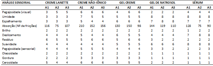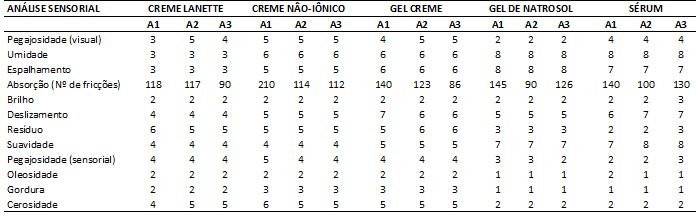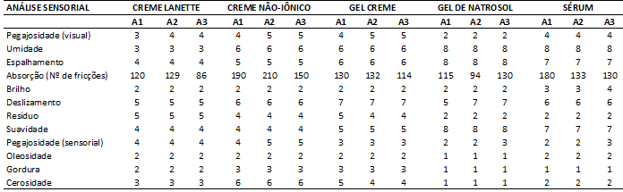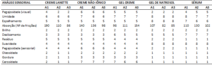 A análise sensorial é uma ferramenta baseada nos estímulos desencadeados pela formulação nos sentidos humanos como visão, tato, paladar, olfato e sabor. Esse tipo de avaliação foi inicialmente utilizado pela indústria alimentícia (Taniguchi, 2017) e por isso não tem uma ficha padrão com todos os parâmetros pré-determinados. Entretanto, vem ganhando cada vez mais importância na indústria de cosméticos, uma vez que o toque e a percepção em relação a um cosmético podem interferir na adesão ao tratamento/uso e impactar diretamente no desenvolvimento e venda do produto (Taniguchi, 2017). Esta técnica permite avaliar a aceitação do produto pelo consumidor, o que em tese é um fator dificilmente avaliado por um método analítico físico-químico (Philippe et al., 2004; Tham, et al., 2016). Não há uma ficha padrão com todos os parâmetros determinados, por isso utilizou-se como referência Palermo (2015) e Minim e Silva (2016) que atribui valor de 0 a 10 para todos os itens, exceto absorção, que é dada pelo número de fricções com que o produto perde a umidade.
