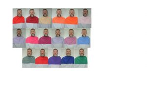 A segunda etapa constatou, através de análise de silhueta, o seu biótipo retangular ou H e sua proporção corporal foi detectada pela régua de proporção Áurea indicando seus membros inferiores num comprimento maior que seu tronco. A análise de coloração pessoal foi realizada no modelo sazonal expandido que é feito com tecidos de cores variadas aplicados no colo da amostra para verificar qual cor se harmoniza com seu corado natural e suas feições, buscando identificar a temperatura da pele quente, fria ou neutra e suas respectivas estações. O teste empregado na amostra revelou sua temperatura fria e sua estação verão puro. Conforme mostra a Figura 1.